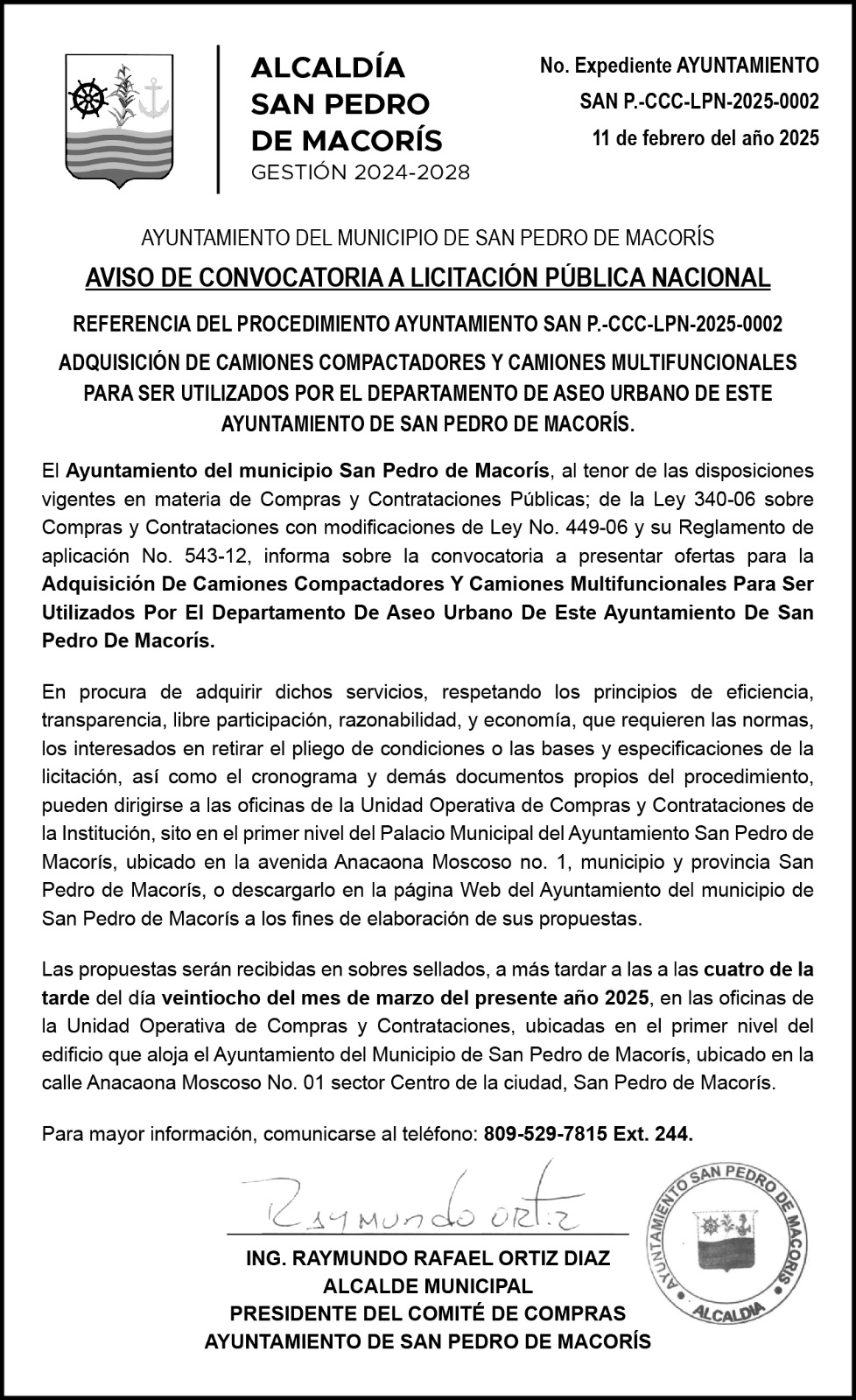 Objeto/Subobjeto: ADQUISICION DE CAMIONES COMPACTADORES Y CAMIONES MIULTIFUNCIONALES PARA SER UTILIZADOS POR EL DEPARTAMENTO DE ASEO URBANO DE ESTE AYUNTAMIENTO DE SAN PEDRO DE MACORIS /
