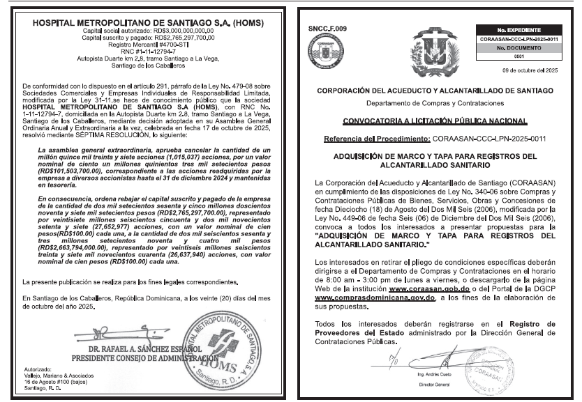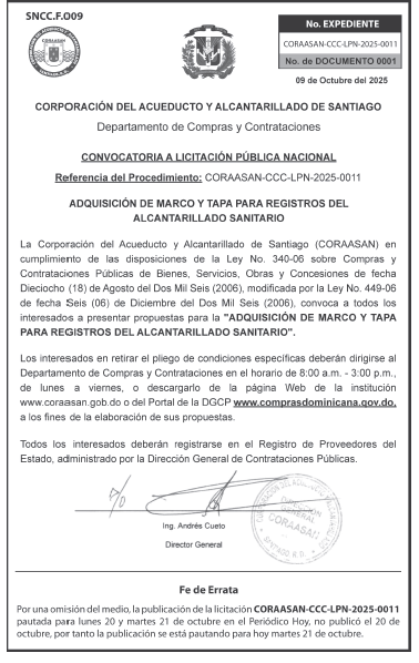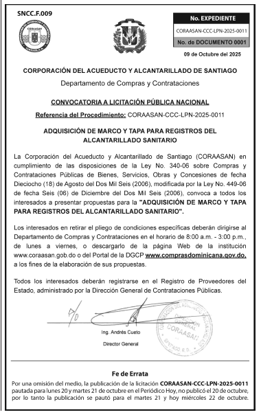 | Garcia y Llerandi, SAS | 3676 | 4,289,300.00 DOP | Oferta digital | 04-12-2025 14:30 | Sin adjudicación detectada | |