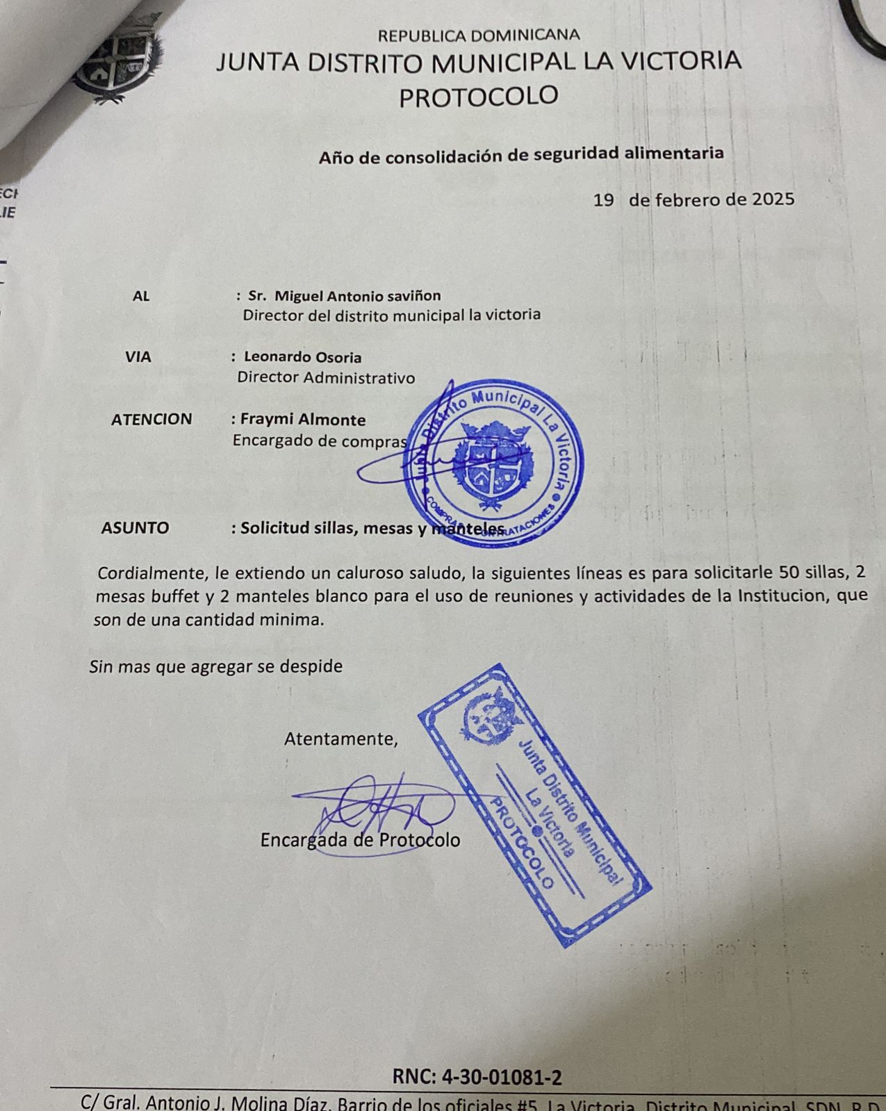 Objeto/Subobjeto: SOLICITUD DE COMPRA DE (50) CINCUENTA SILLAS, (2) DOS MESAS DE BUFFET Y ( 02) DOS MANTELES BLANCOS /