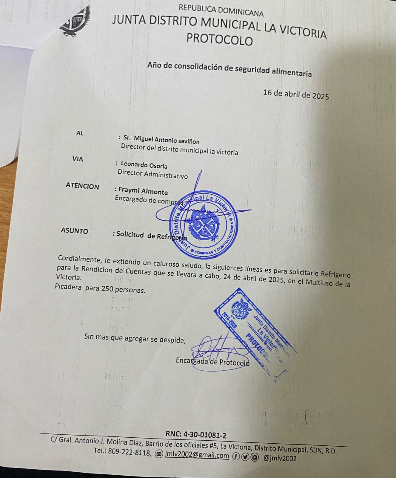 SOLICITUD DE SERVICIO DE REFRIGERIO PARA (250) DOCIENTAS CINCUENTAS PERSONAS PARA LA RENDICUION DE CUENTAS. (JDMV-DAF-CD-2025-0037)