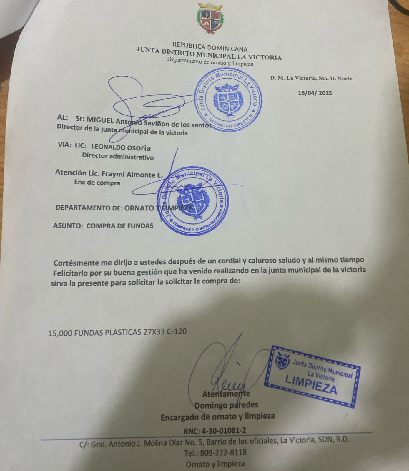 SOLICITUD DE COMPRA DE 15,000 FUNDAS PLASTICAS 27X33 CALIBRE 120 PARA SER UTILIZADAS EN EL DEPARTAMENTO DE LIMPIENZA Y ORNATO. (JDMV-DAF-CD-2025-0038)