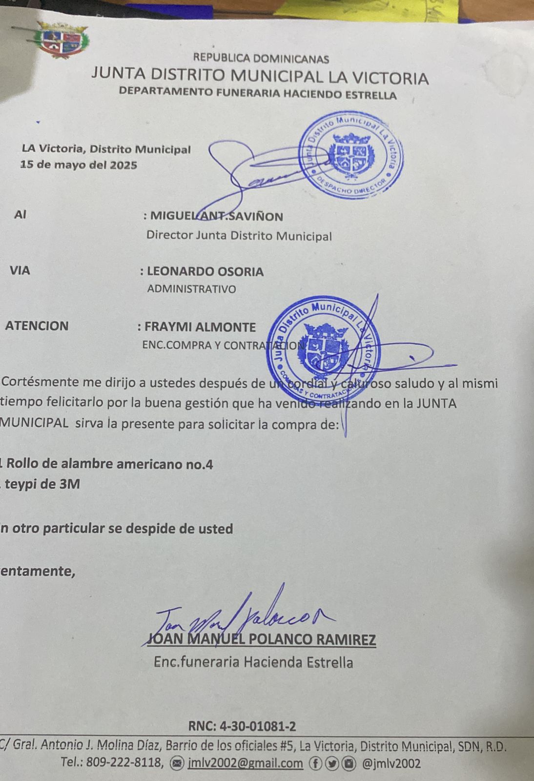 SOLICITUD DE COMPRA DE 1 ROLLO DE ALAMBRE AMERICANO #4, Y 1 TEYPI DE 3M PARA LA INSTALACIÓN DE ELECTRICIDAD DE LA FUNERARIA HACIENDA ESTRELLA.