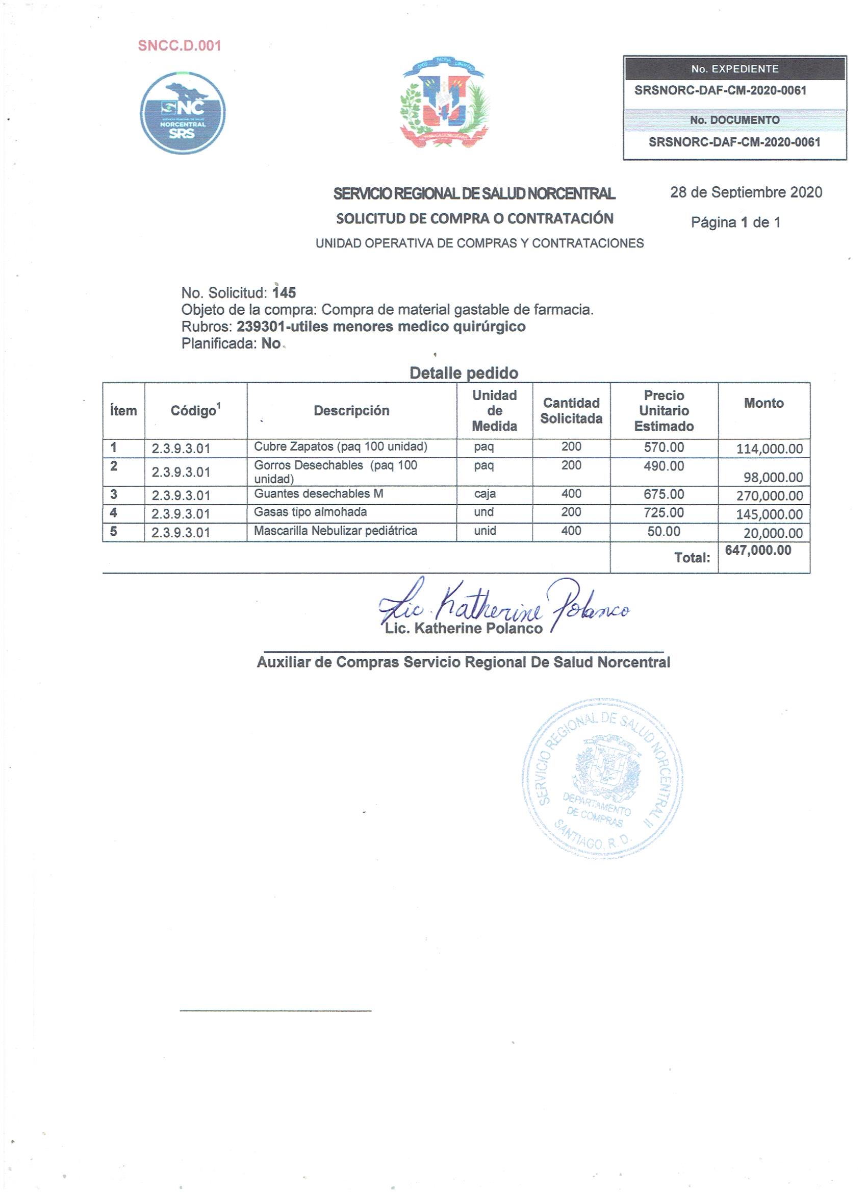 | 1 | 42131609 | Cubre Zapatos (paq 100 unidad) | 200 | 570.00 | 114,000.00 |