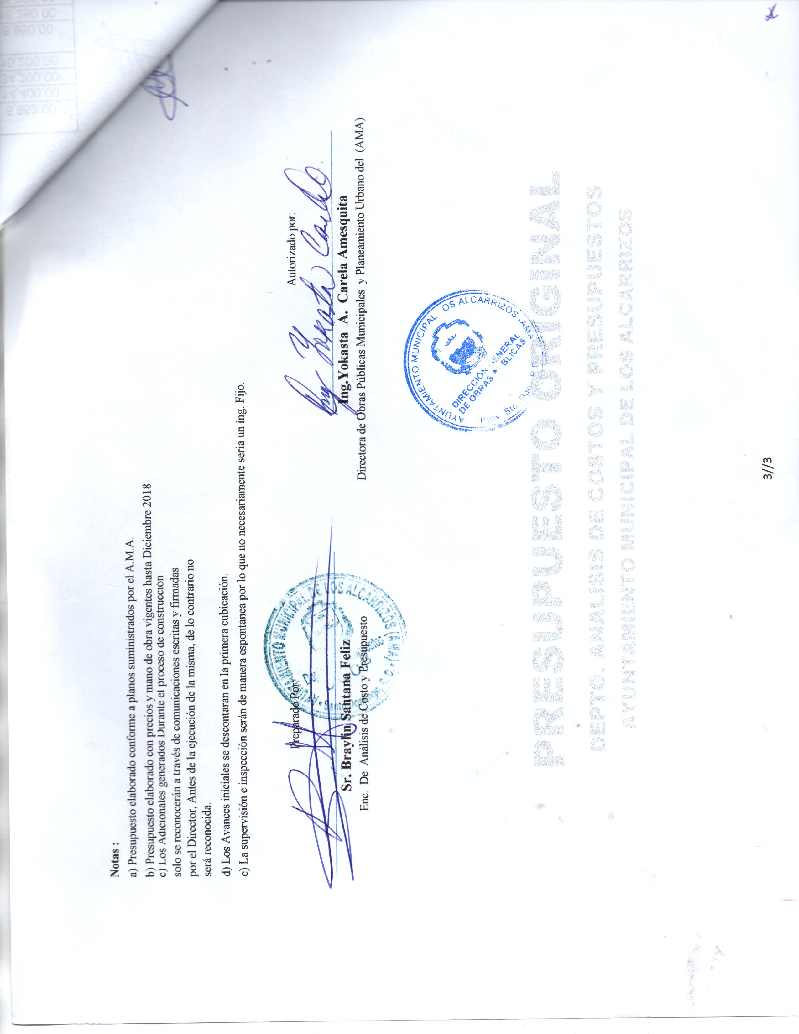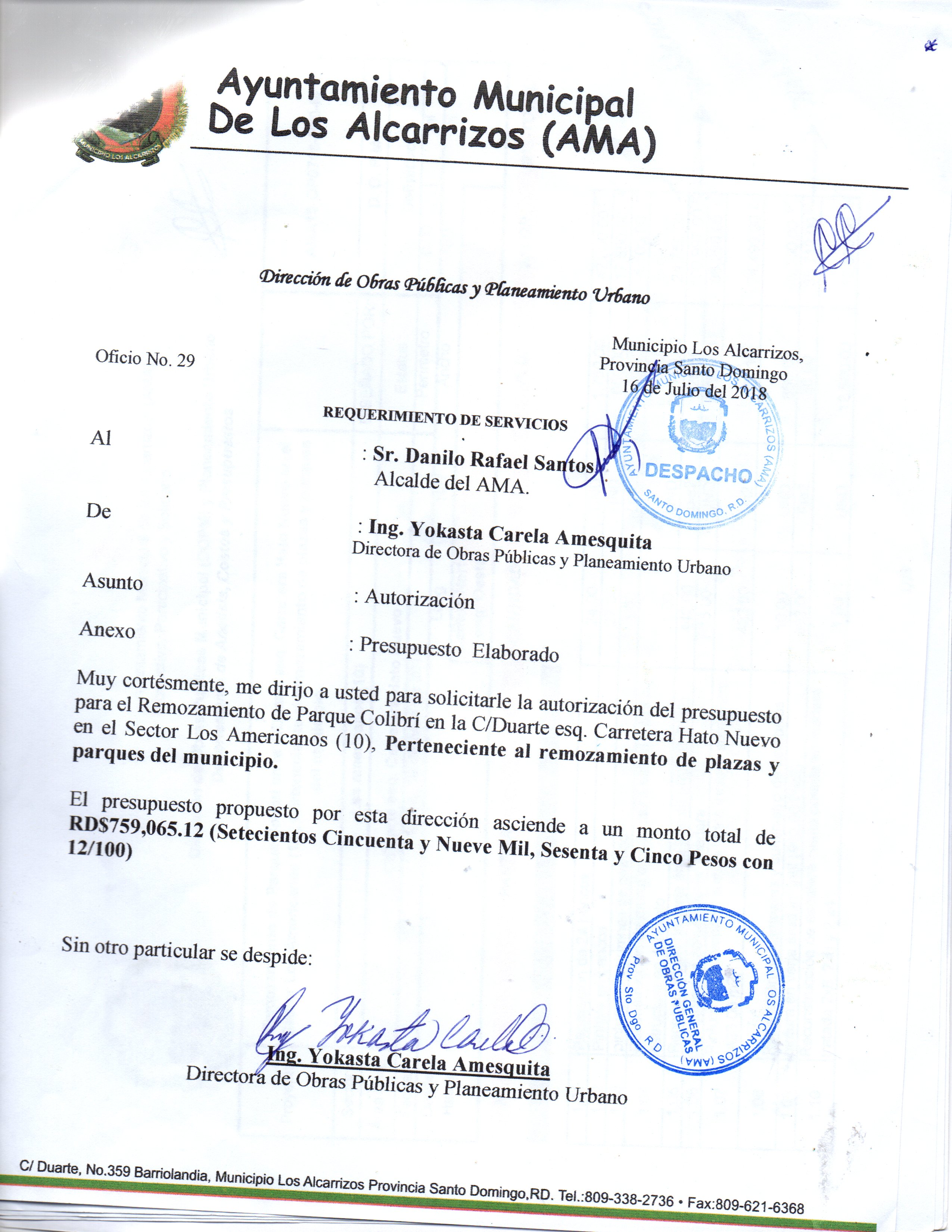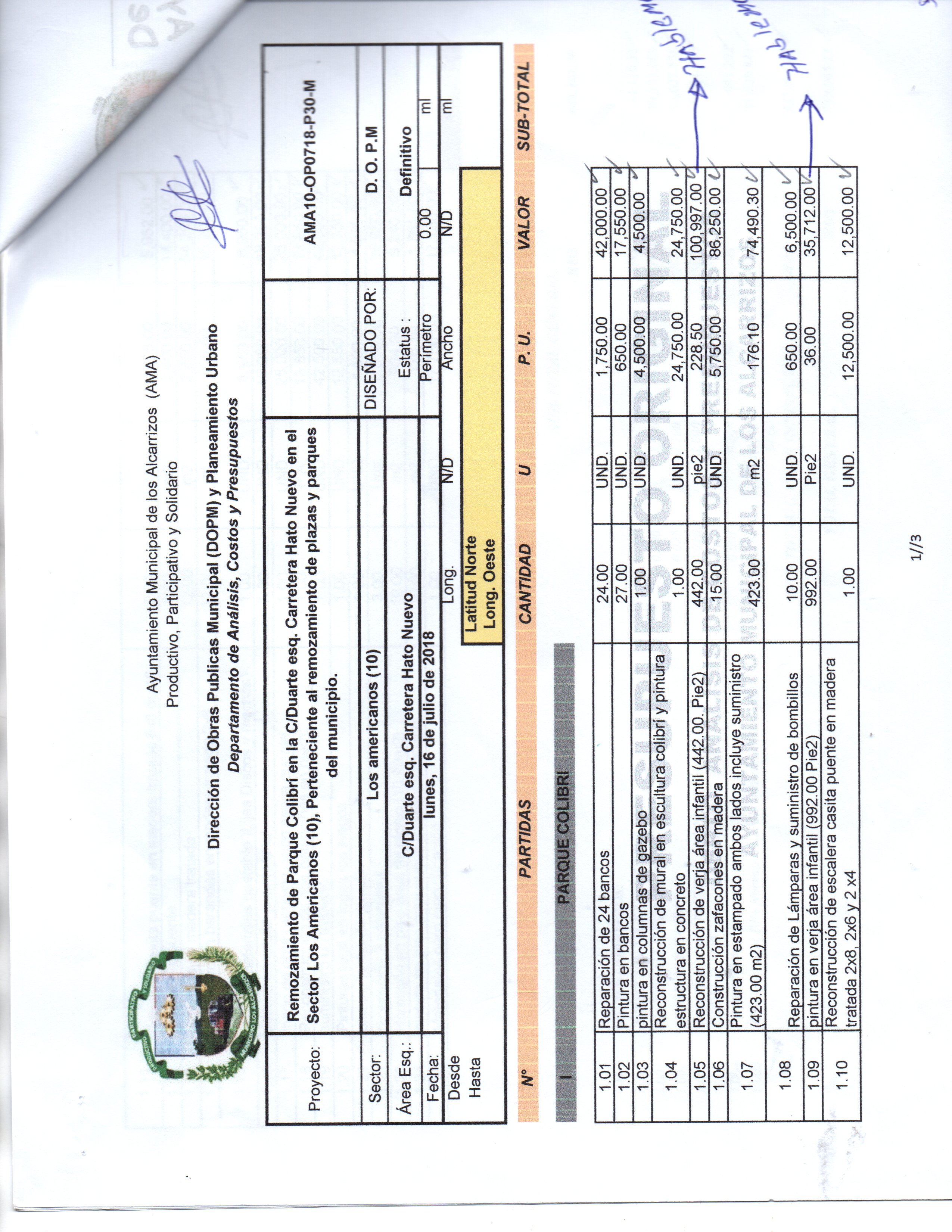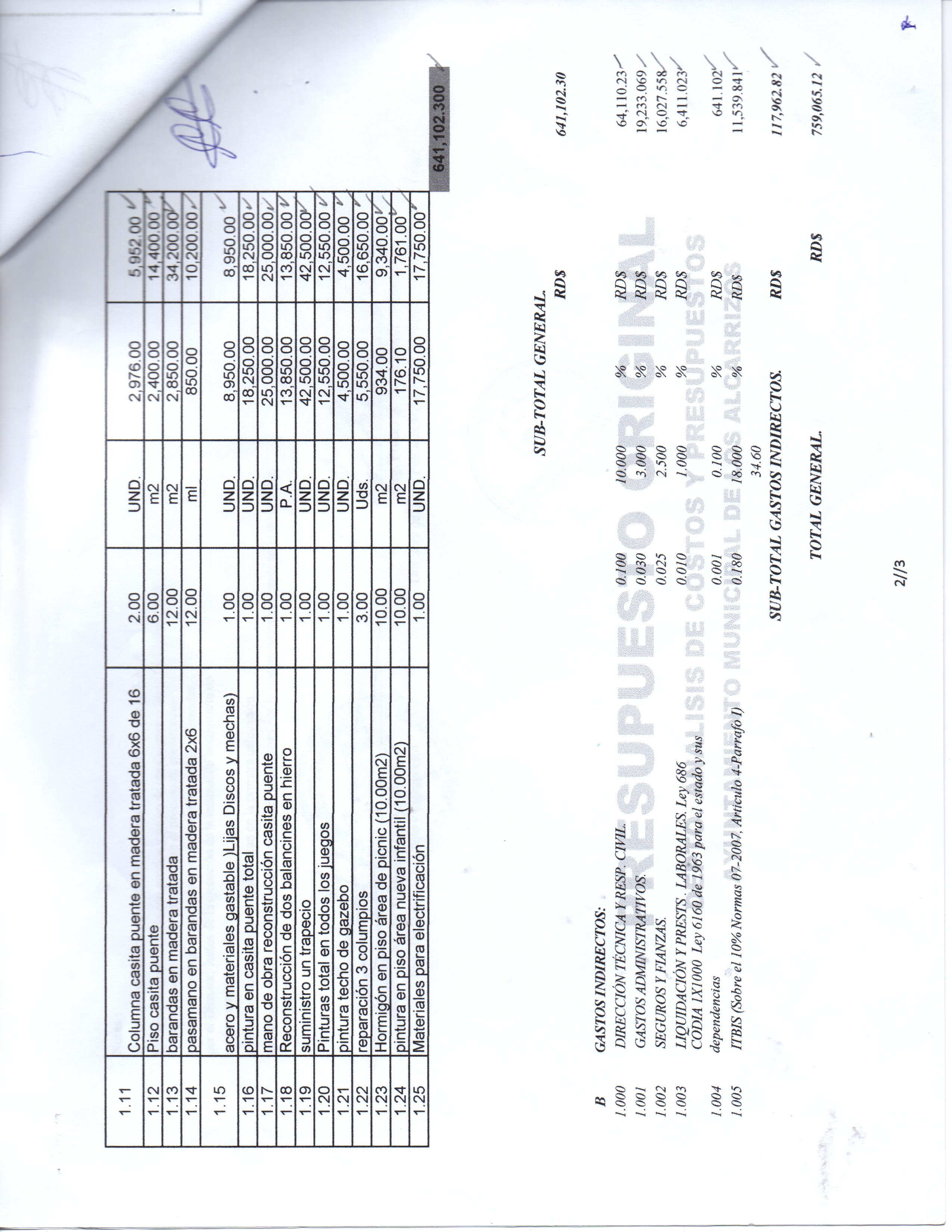 | 1 | 72102902 | Reparacion de 24-bancos, Pintura, columnas de gazebo, Reconstruccion de mural, Verja area infantil, Zafacones en madera, Reparacion de Lamparas, Escalera Ect. | 1 | 641,102.30 | 641,102.30 |