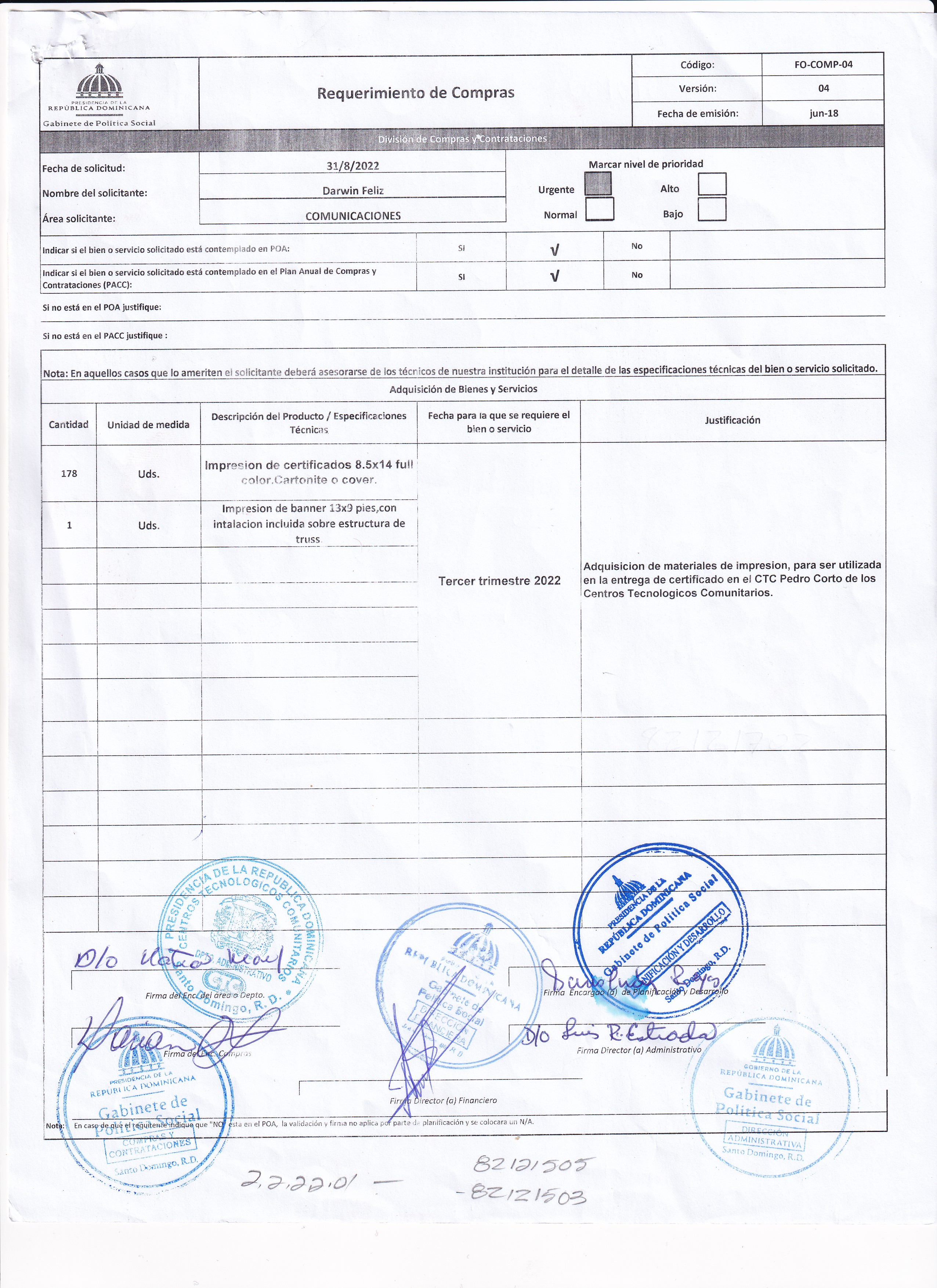 | 1 | 82121503 | Impresión de Certificados 8.5 x 14 full color. Cartonite o cover. | 178 | 212.40 | 37,807.20 |