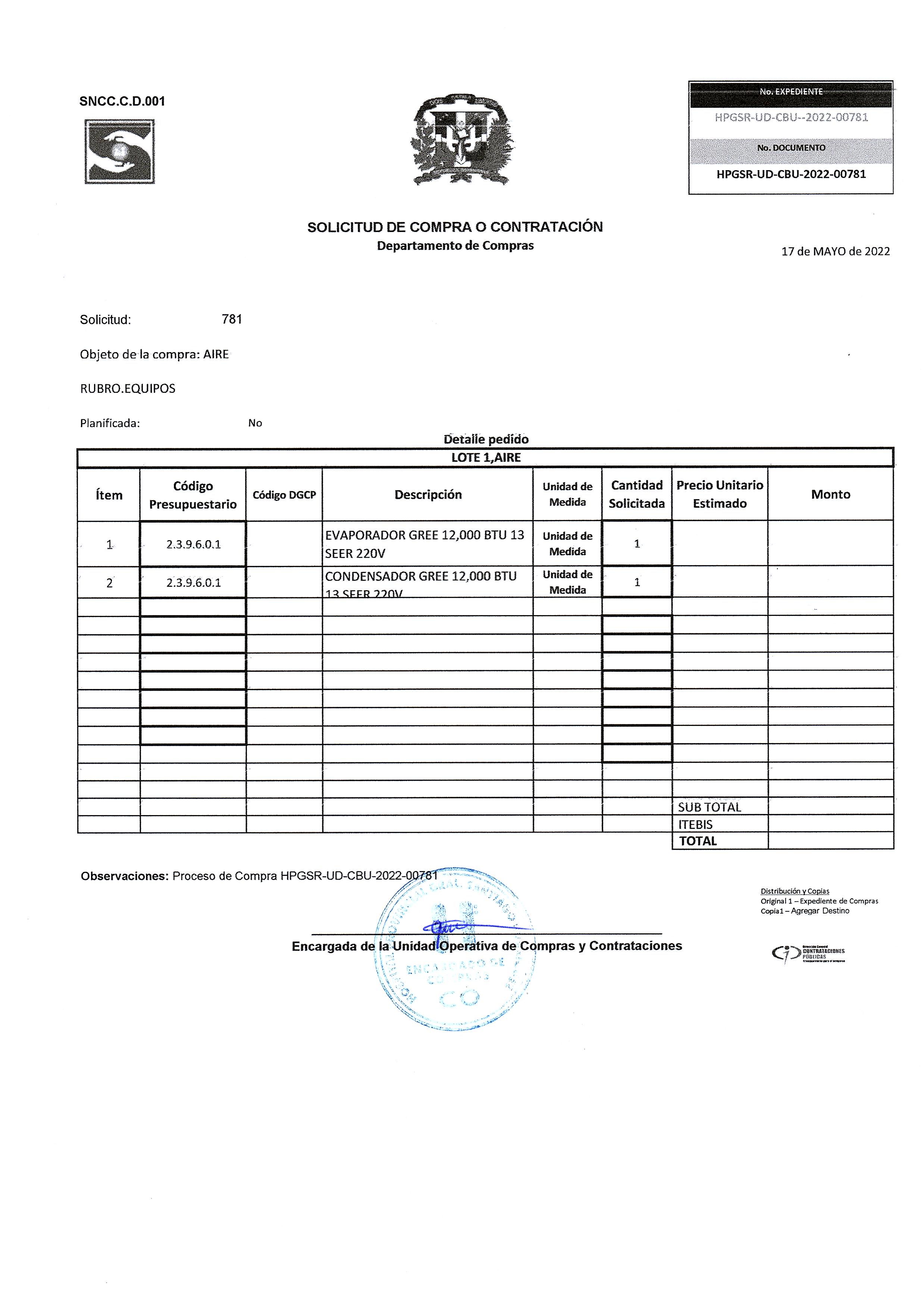 | 1 | 40101701 | EVAPORADOR GREE 12,000 BTU 13 | 1 | 23,500.00 | 23,500.00 |