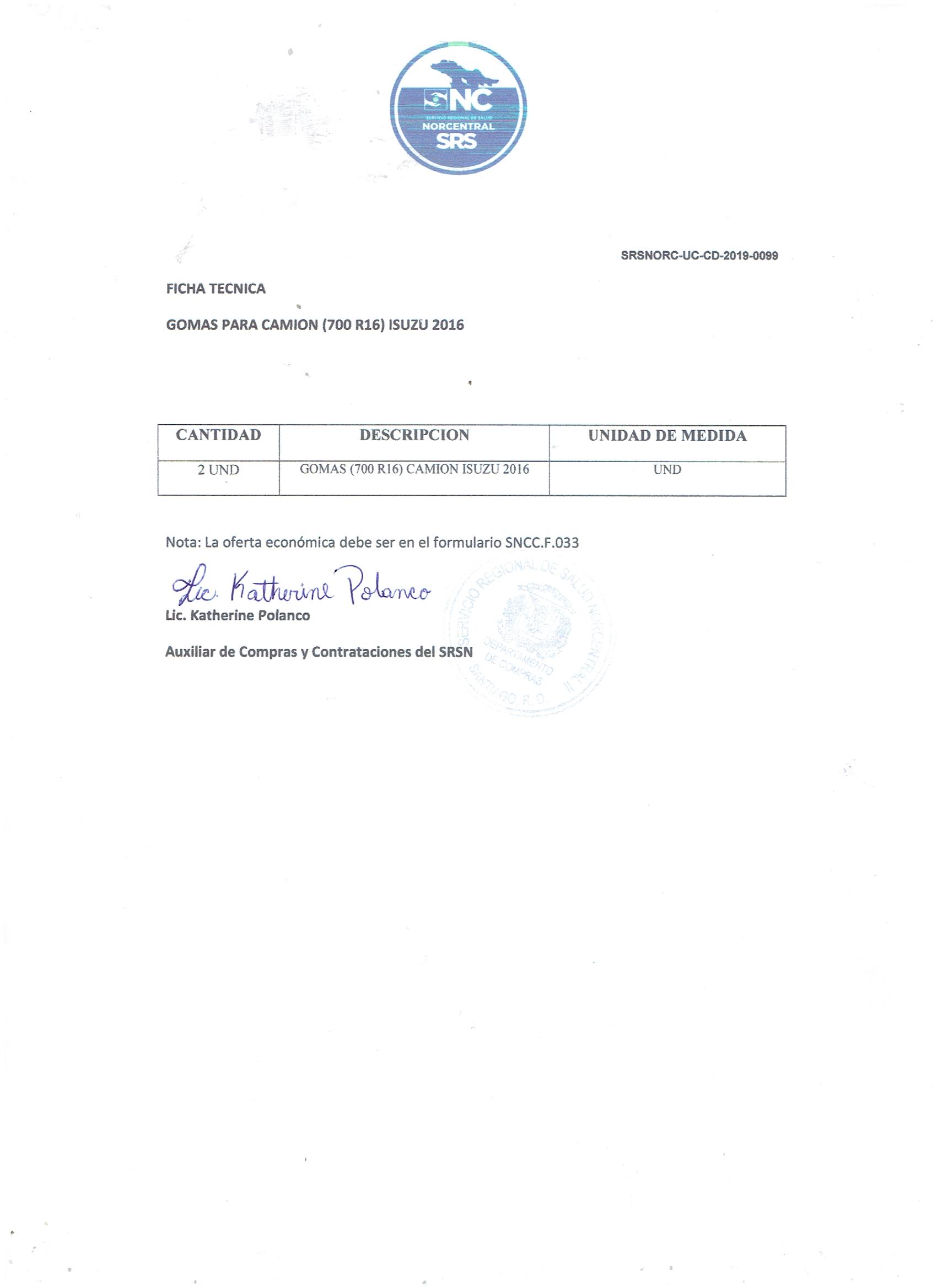 | 1 | 31201603 | GOMAS (700 R16) PARA CAMION ISUZU 2016 | 2 | 10,000.00 | 20,000.00 |